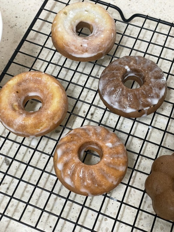 도넛을 꺼내어 한 김 식힌다.